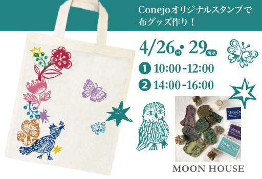 Conejo AYAKAオリジナルスタンプの中からお好きな図案を選び、バッグやハンカチに自由にレイアウト。お好きな色でスタンプし、世界にひとつの作品を制作していただきます。