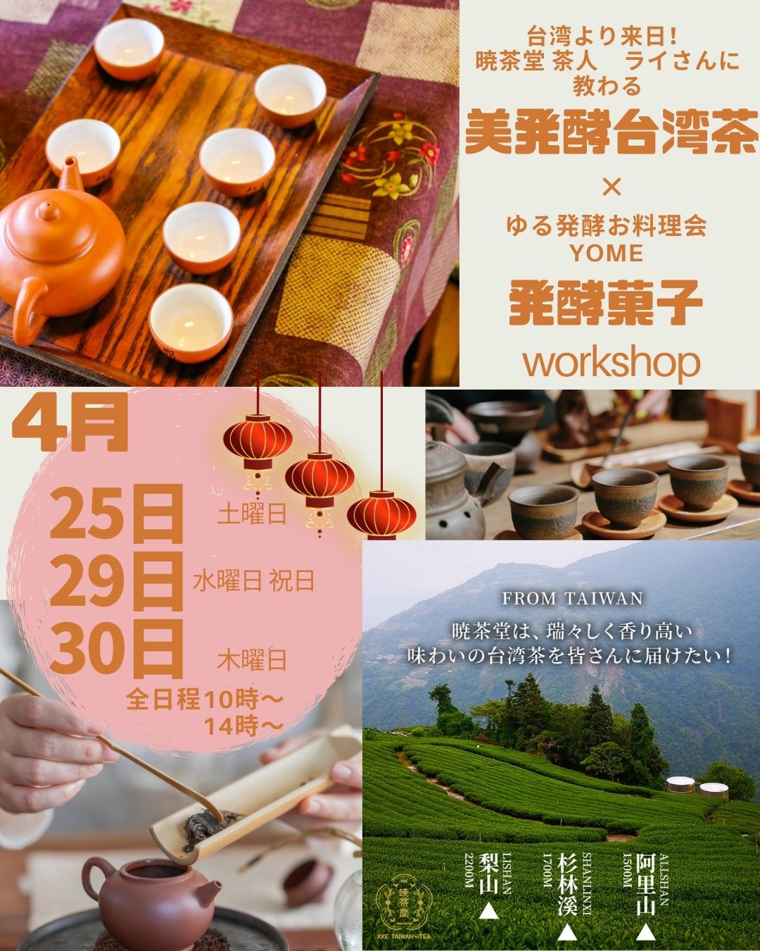 - 各回 8名 4月の台湾茶の会は 10時~ と 14時~の開催 5月の5倍麹味噌の会・官足法と麦味噌・精麻ドリームキャッチャーの会は 12時~になります。